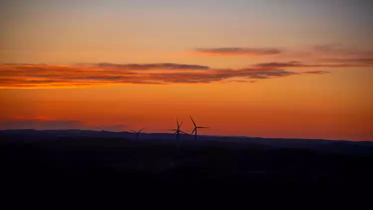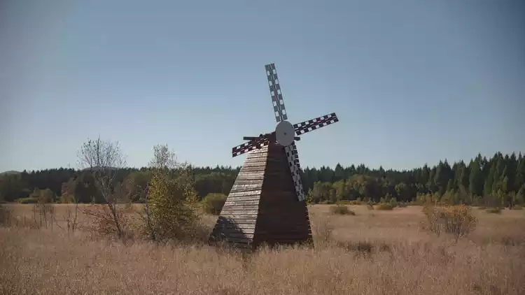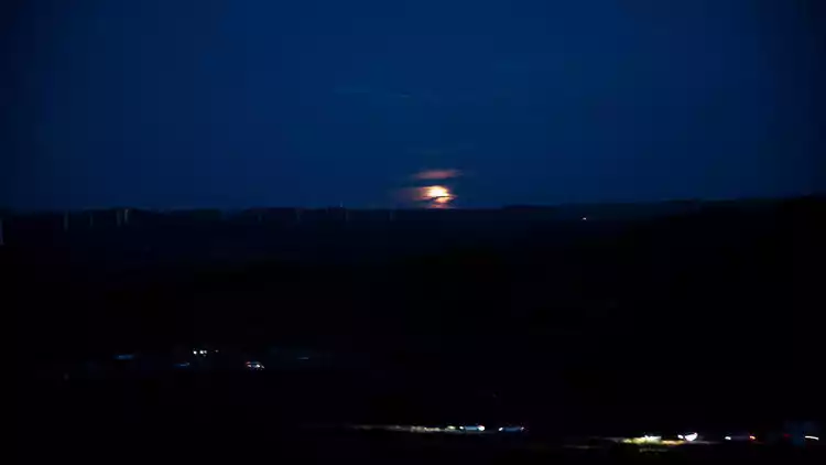 There is a bright and round moon hanging in the sky, and there is a big windmill nearby. Everything is so beautiful and quiet, as if it is a world in a fairy tale.