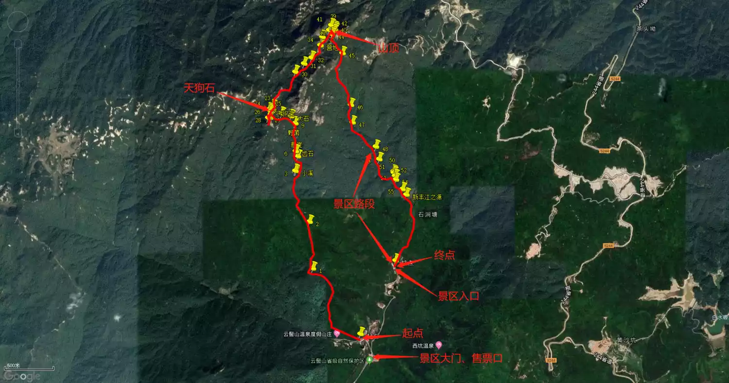The image below shows the hiking route. The route is approximately 10 kilometers long, with a cumulative elevation gain of 1,030 meters, and takes about 7 hours. There are restrooms at the start and end of the hike, but no restrooms or refueling points along the way.