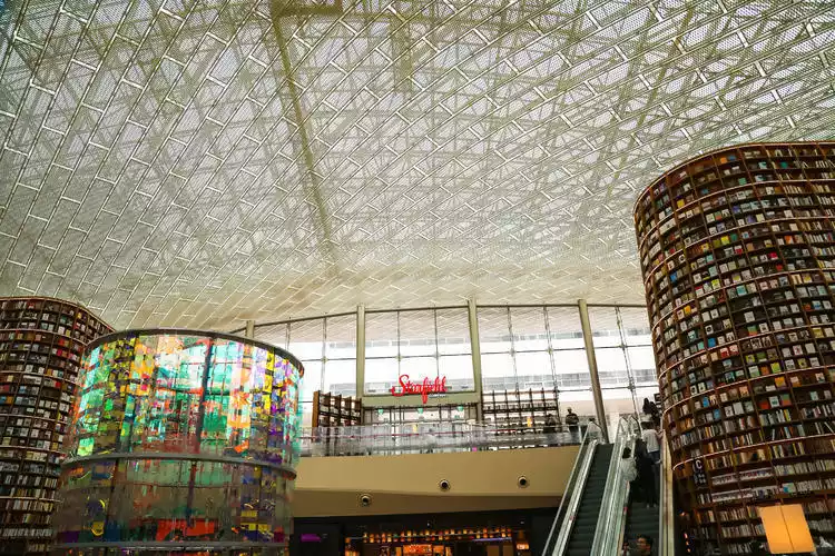 This library in Seoul is a highlight for its grandeur and romantic atmosphere. For locals, it's a gateway to knowledge. On the second floor, there are many quiet areas perfect for reading. For us, however, we were more interested in taking photos and checking in.