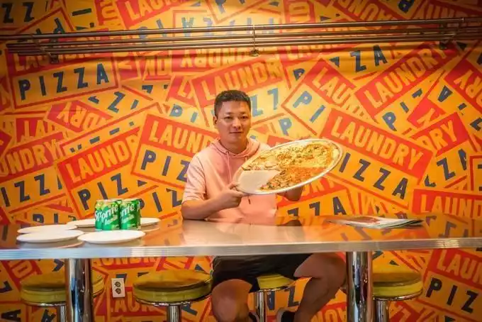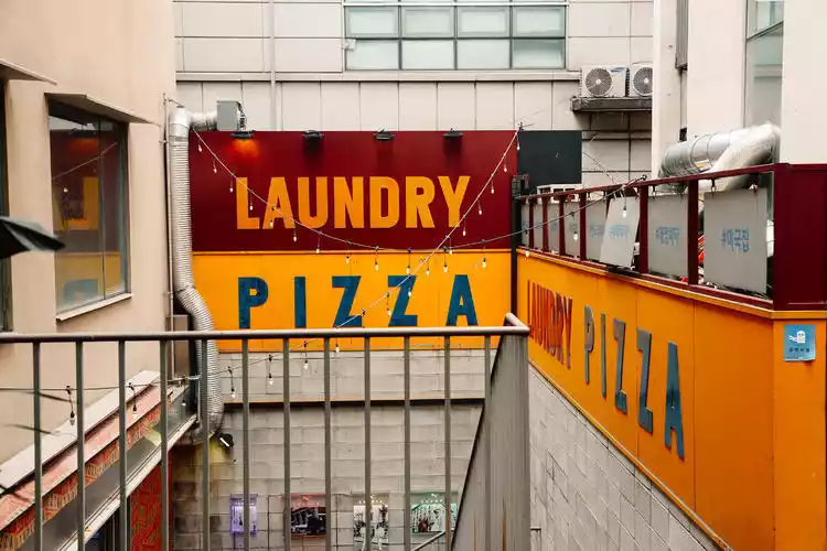 Having visited many popular photo spots in Seoul, as young people, we absolutely can't skimp on food. So, I found myself at a popular restaurant. It's an American laundry-themed pizza place with a very cool decor. There are even posters on the wall, suggesting Korean girl groups have dined there. It's also the location where the album cover for BTS' DNA was filmed.