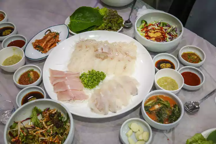 After buying your seafood, head upstairs next to the market where the seafood processing facility is located. Enjoy a seafood feast on a traditional Korean floor table. The processing fee is quite affordable, and the restaurant also provides a few side dishes to keep you full!