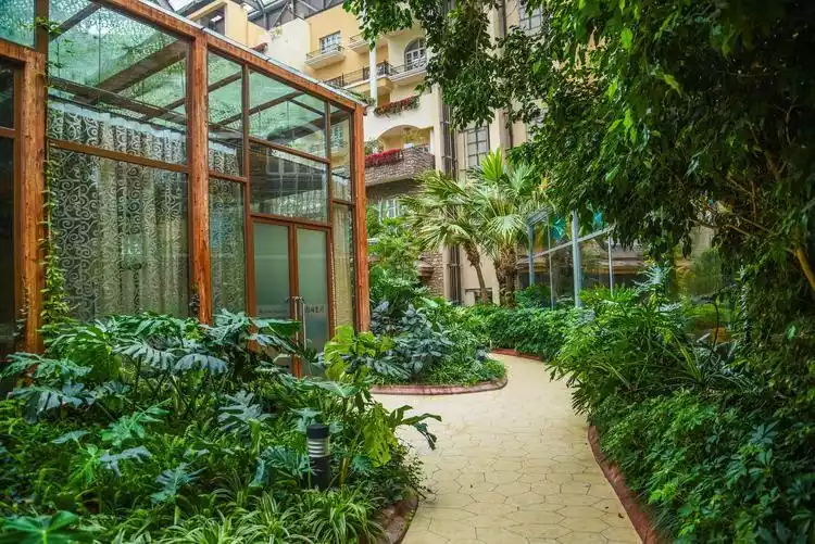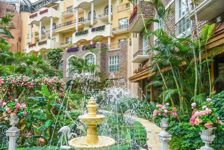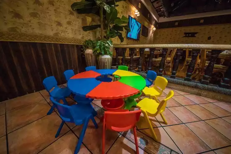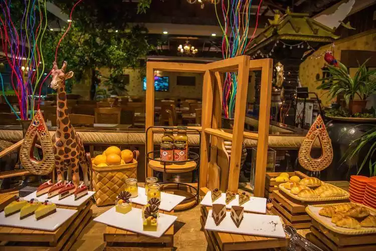 The Tropical Rainforest Restaurant is built entirely in the style of a tropical rainforest, with banana trees, palm leaves, fountains and pools, and the yellow beach tones. Are you in Bali or Padang Beach?