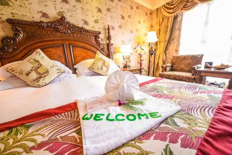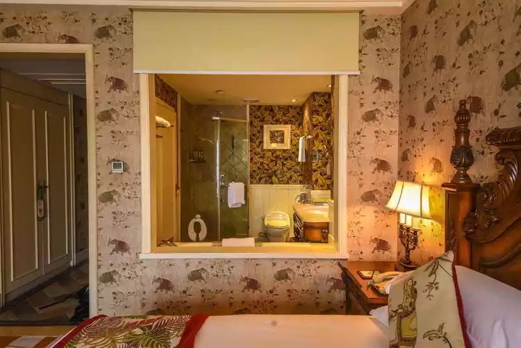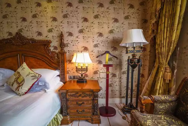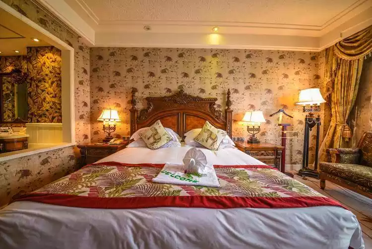As for accommodation recommendations, we chose the First World Hotel. It's conveniently located near Hangzhou Amusement Park, and you can hear the screams of the roller coaster from the moment you open the window. The hotel boasts a European palace-style ambiance, exuding understated luxury. With warm yellow hues, lace curtains, a small chandelier, and a large, carved bed, you can be your own king here.