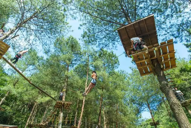 The scenic area has designed six jungle leap routes, varying in length and difficulty, including routes suitable for families. The various ways to navigate, such as zip lines, plum blossom piles, and ropes, are quite challenging. The one-way movement is unstoppable, making this place a love-hate attraction for many.