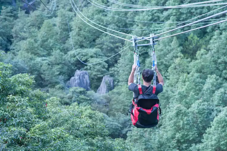 Take safety precautions and experience true speed and excitement. As you descend from the summit, the mountain wind whistles past your ears, like wings, soaring through the mountains and forests. Taking advantage of the height difference between the two peaks, in just a few minutes, you'll pass through the mist, taking in the panoramic views of strange rocks, unique trees, and streams.