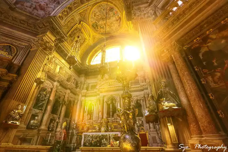 When we entered a small chapel inside the church, a beam of sunlight came in, passed through the glass, and cast on the golden decoration inside, which looked extremely beautiful, just like the sentence in the Bible: "God said, "Let there be light," and there was light.