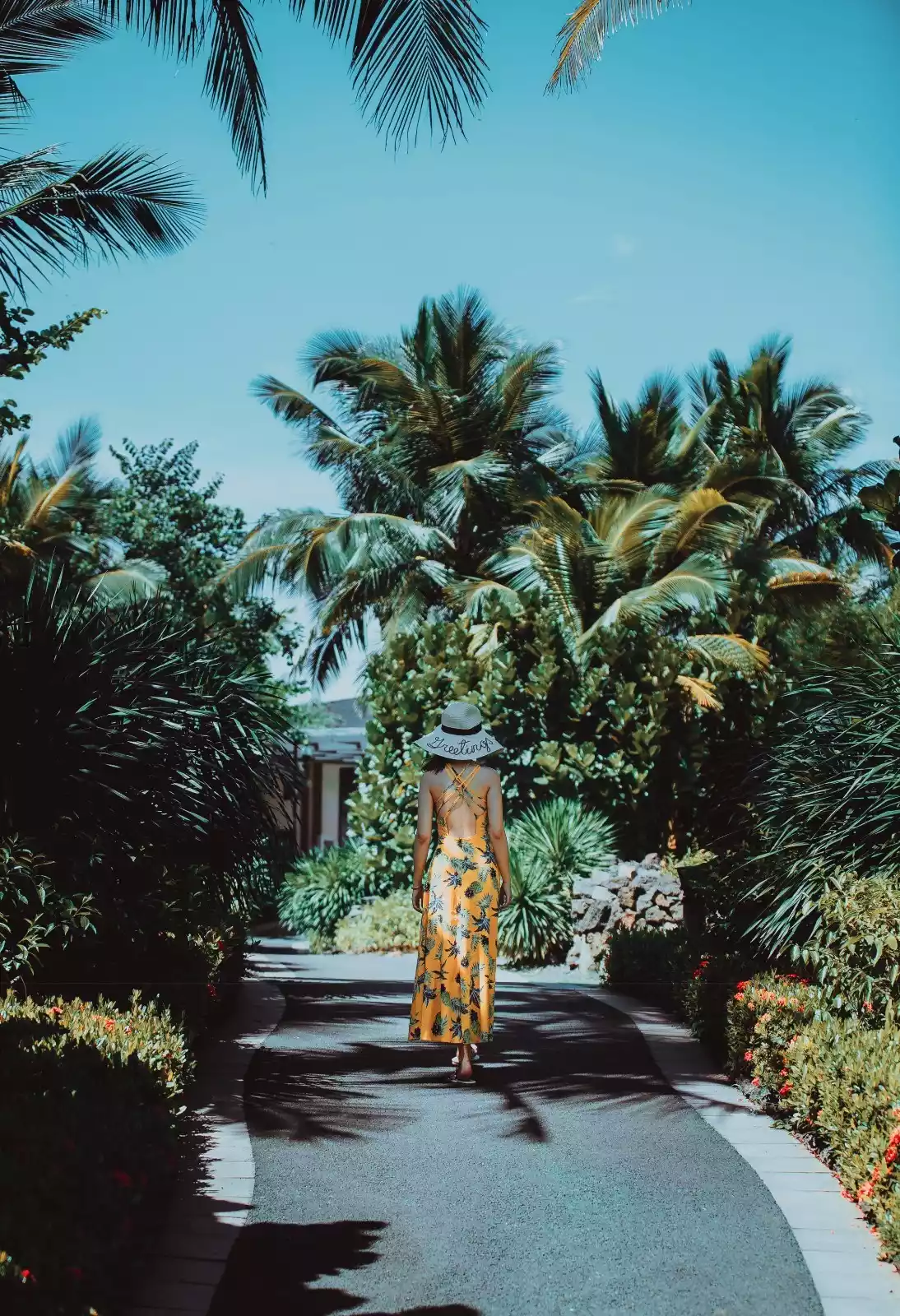 Swimming happily in the embrace of coconut trees is also a good choice to show off your figure and create a good look.