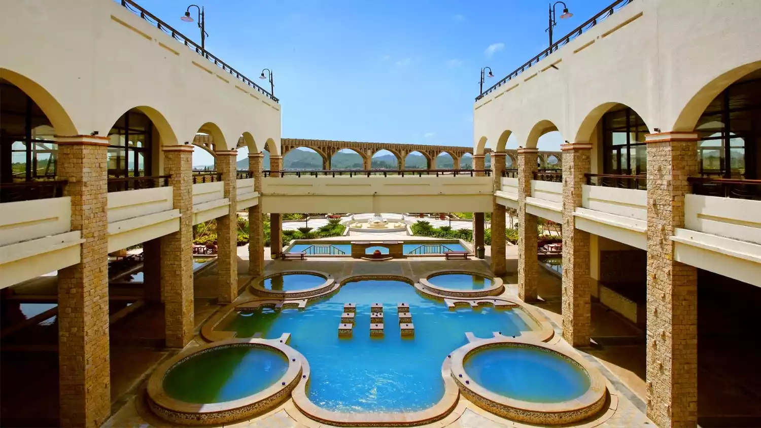 Located in Yunxiao County, Zhangzhou City, known as the "Holy Land of Kaizhang," the Jintang Bay Seawater Hot Spring Resort Hotel is adjacent to Dongshan Island. This five-star hotel is a national 4A-level scenic spot. Surrounded by mountains on three sides and facing the sea to the south, the resort features Roman-style architecture, imbued with a rich Mediterranean atmosphere, and the overall design evokes a sense of freedom, romance, and relaxation.