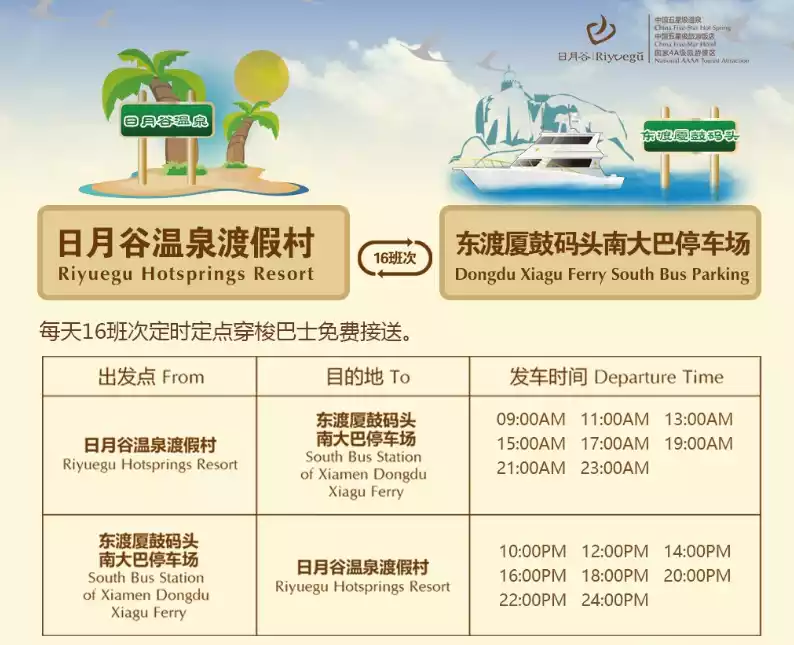 The shuttle bus service between Riyue Valley and Xiamen-Guangzhou Wharf is available at designated locations. The bus departs every 2 hours from 10:00 AM to 12:00 PM. Seats are limited, so first come first served.