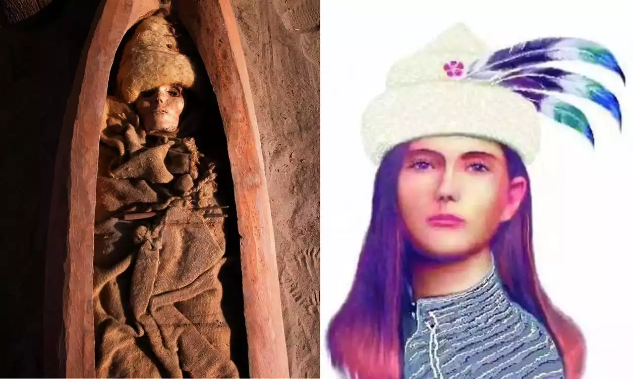 The Little River Princess, unearthed in Lop Nur in 2004, dates back 3,500 to 4,000 years. Her lifelike appearance is amazing. On the right is a restored image of the Little River Princess of Lop Nur.