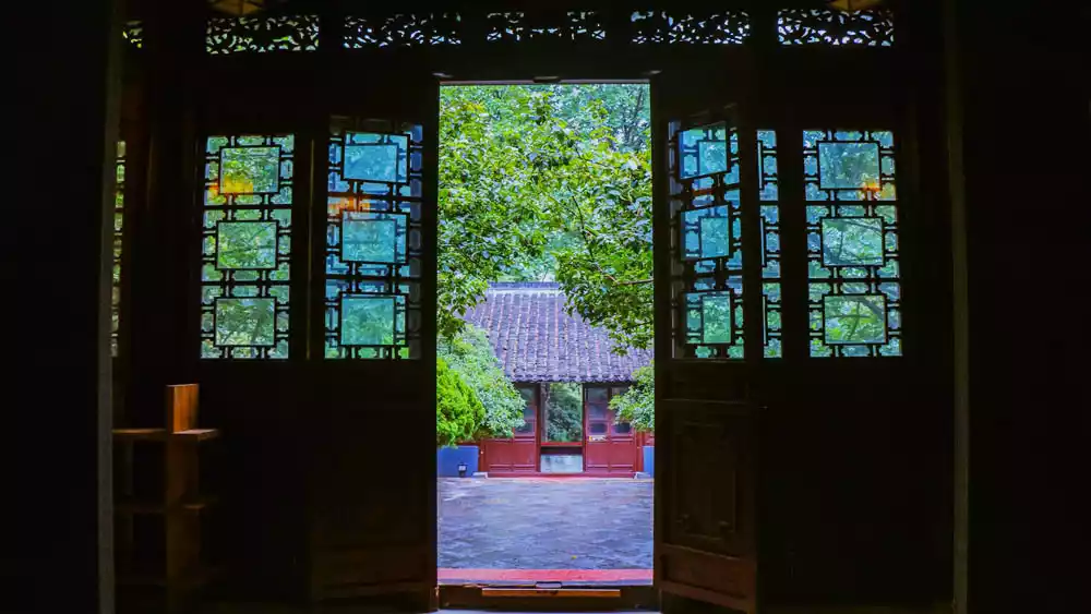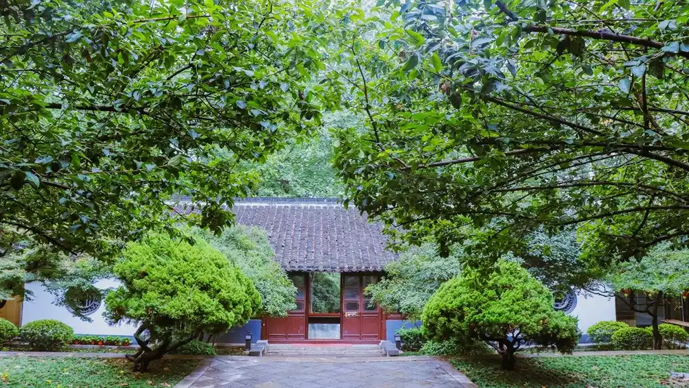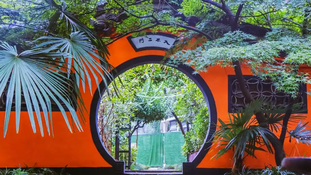 "Non-duality" means non-duality, transcending all opposition. "Door" refers to the Dharma door, the path to Zen meditation and enlightenment. Red walls and green trees create a tranquil and ancient atmosphere. (Image source: Jin Yu)