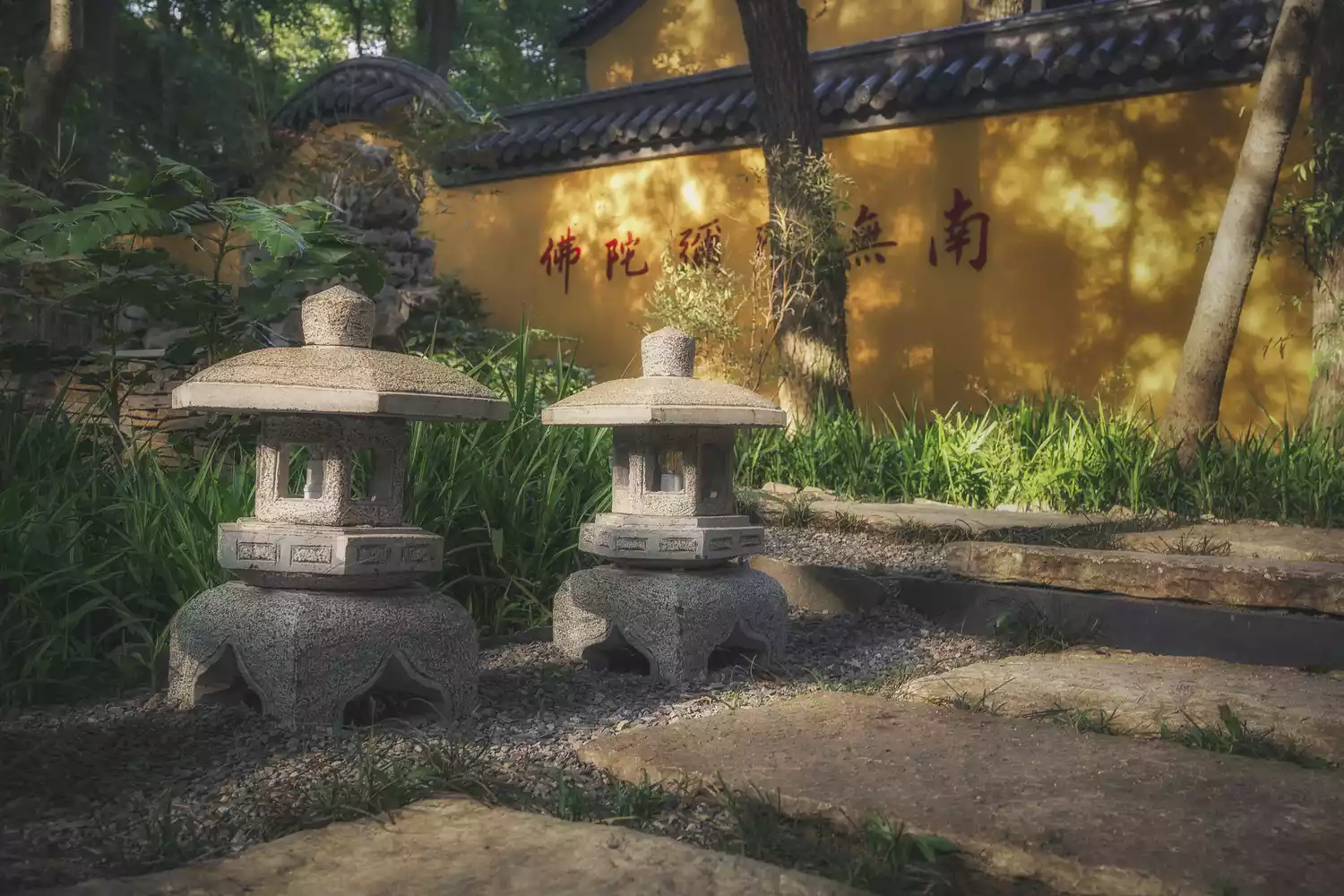 "Non-duality" means non-duality, transcending all opposition. "Door" refers to the Dharma door, the path to Zen meditation and enlightenment. Red walls and green trees, in a quiet and secluded setting, evoke an ancient charm.