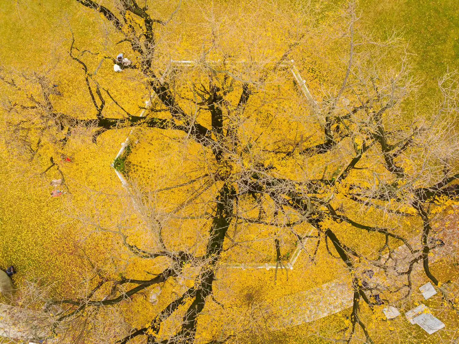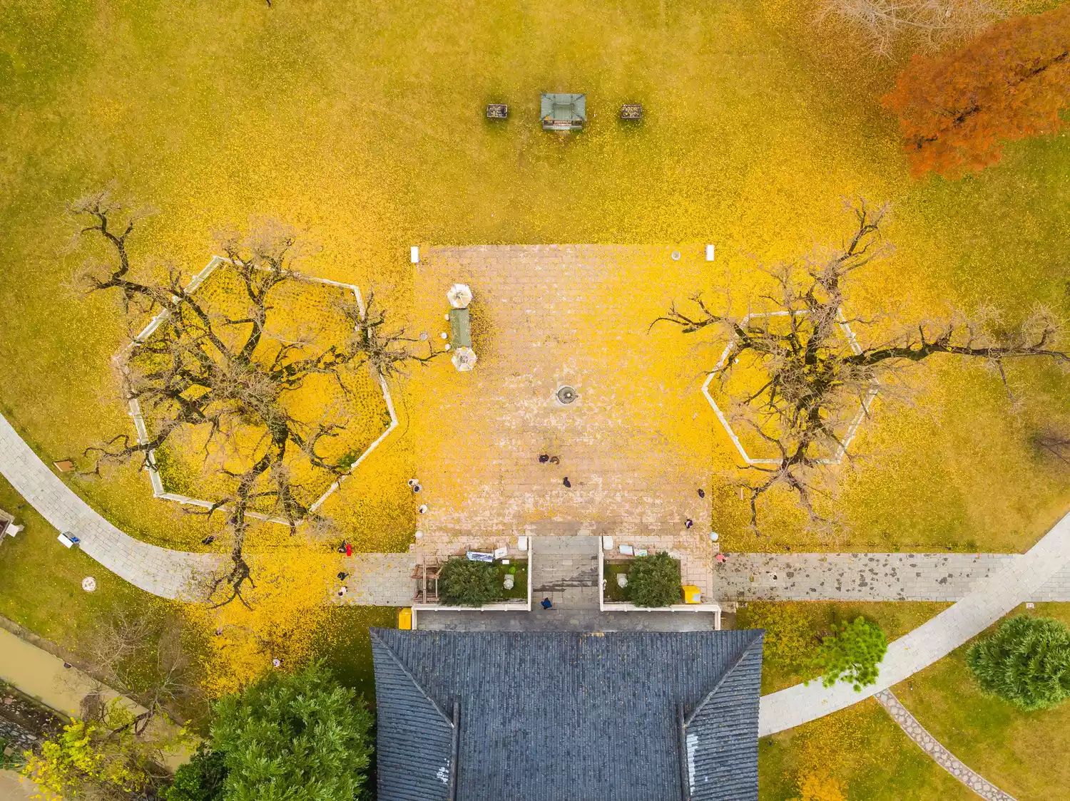 ▲In late autumn, the valley is covered with golden fallen leaves, and the stone benches and pavilions are also covered with a thick layer of leaves, which is gorgeous and ancient.