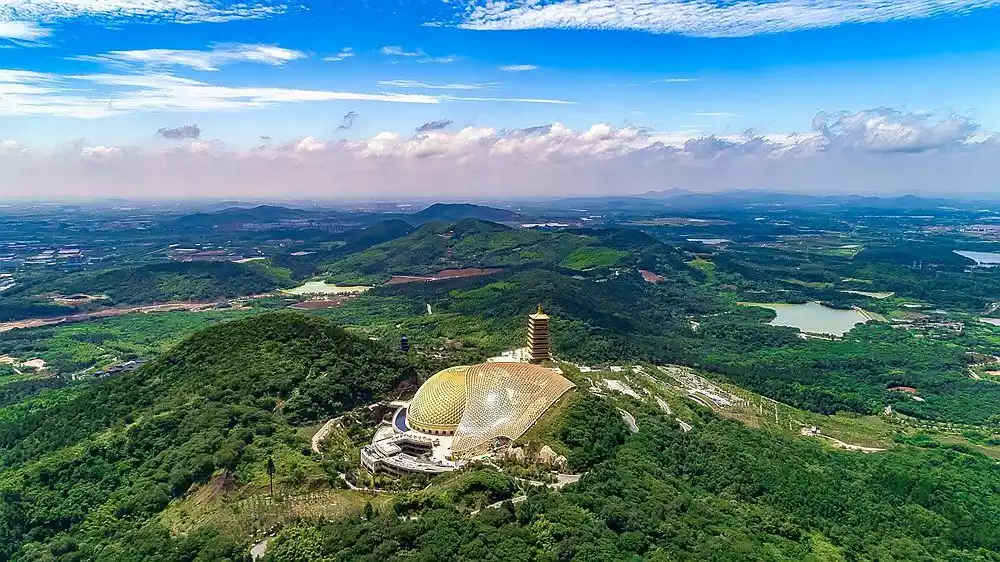 The Buddha's Head Palace is located in Niu Shou Mountain Ruins Park in Jiangning District, Nanjing. Spanning a total area of approximately 10.8 square kilometers, the palace is a deep pit structure, 220 meters long, 160 meters wide, and 89.3 meters high, with a single building area of approximately 136,000 square meters. Designed with the theme of offering sacrifices, the palace's interior is divided into nine floors: three above ground and six underground. The underground floor comprises the Relic Hall and the Relic Storage Hall.