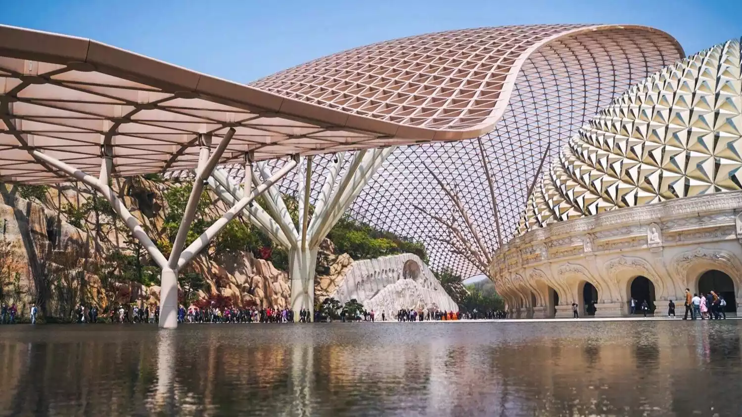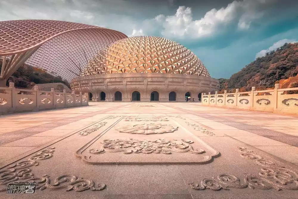 The Buddha's Crown Palace is themed around offerings and consists of two domes, the larger and smaller, representing external and internal offerings. The larger dome, 120 meters long and shaped like the Buddha's robe, echoes the Niu Shou East Peak and overlies the smaller dome of the underground palace, symbolizing the Buddha's boundless blessings. The smaller dome, while shaped like the Buddha's hair bun, features a single dome with clasped hands, symbolizing the offerings of millions of believers to the Buddha.