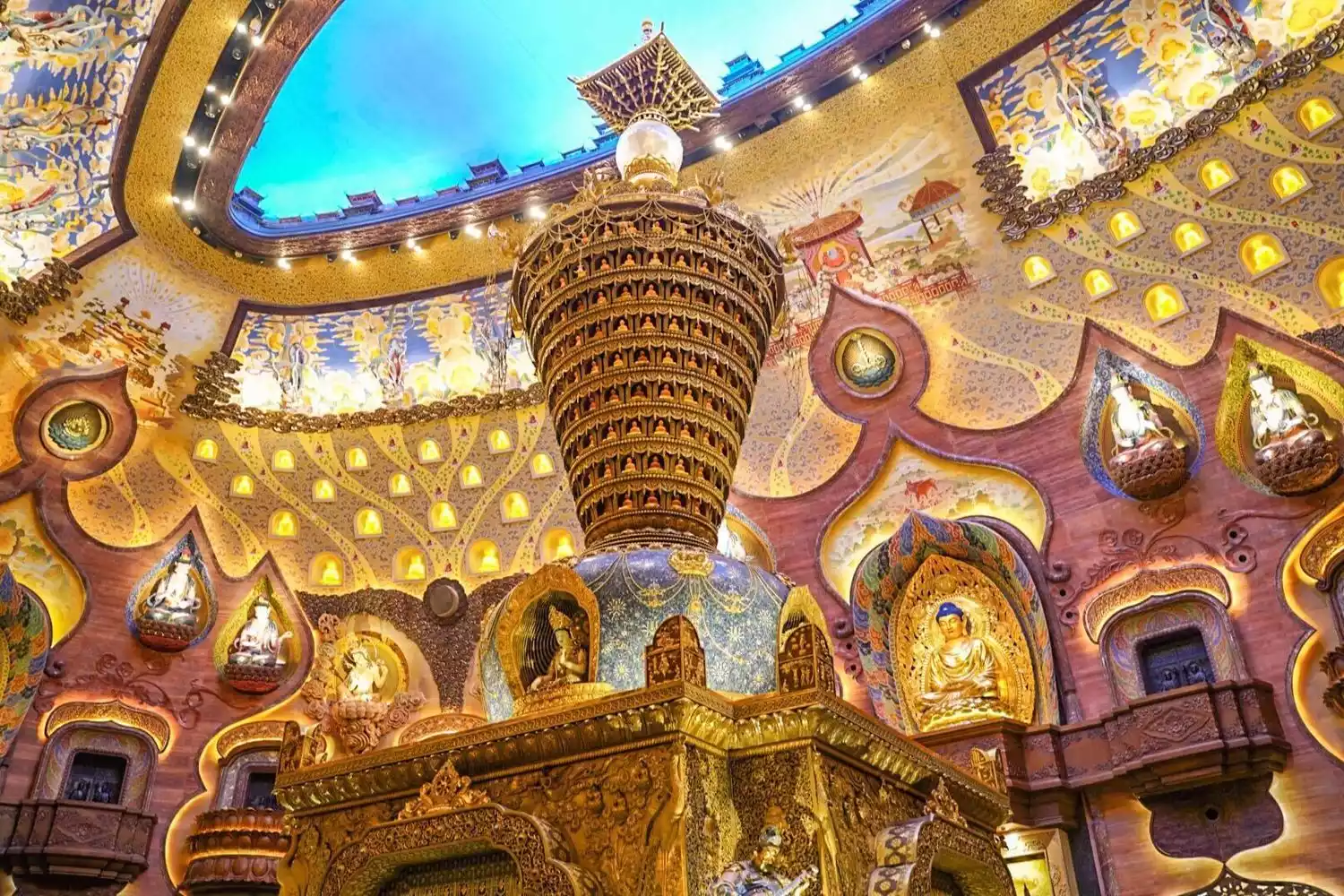At the lowest level of the dome, within the most sacred palace of the entire site park, lies the skull relic of Sakyamuni Buddha. This replica pagoda, inlaid with the "Seven Treasures" of Buddhism—gilt, crystal, colored glass, and gemstones—incorporates dozens of traditional crafts, including bronze, gilt, cloisonné enamel, sculpture, and engraving, and is enhanced by laser projection, resulting in a truly exquisite masterpiece.