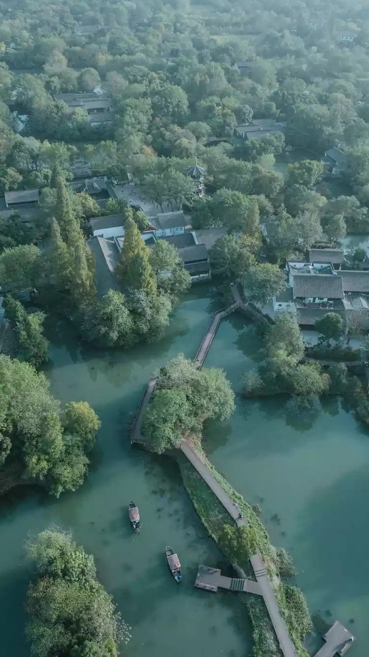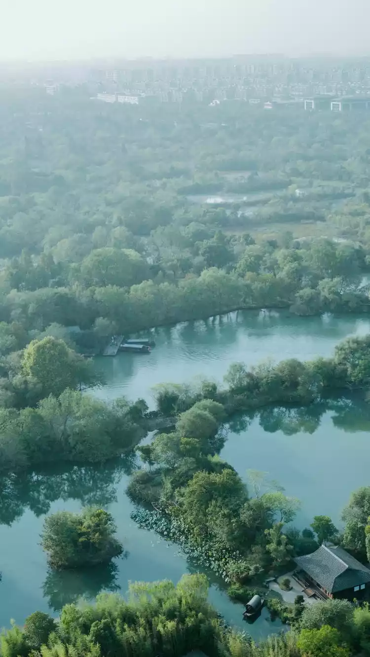 The Xixi Wetland's river courses stretch nearly 100 kilometers, and the high humidity often creates misty skies. While the scenery appears tranquil and beautiful from above, it takes on a celestial beauty from above!