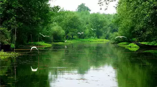 In spring and summer, the scenery is green everywhere. When you glide by boat, you don't hear the hustle and bustle of traffic, but only the sound of water. It seems as if you are the only one left in the world.