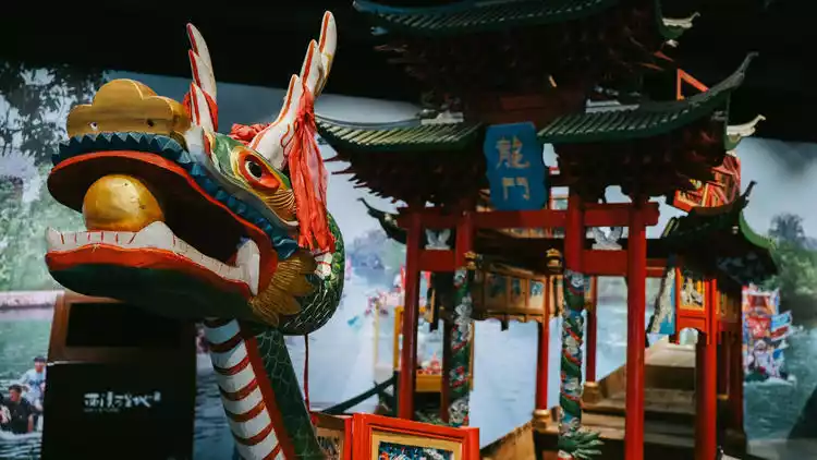 There are dragon boat races every year during the Dragon Boat Festival in Xixi, so there is an exhibition hall in Jiangcun Market with several lifelike dragon boats that are finely carved and look like works of art.