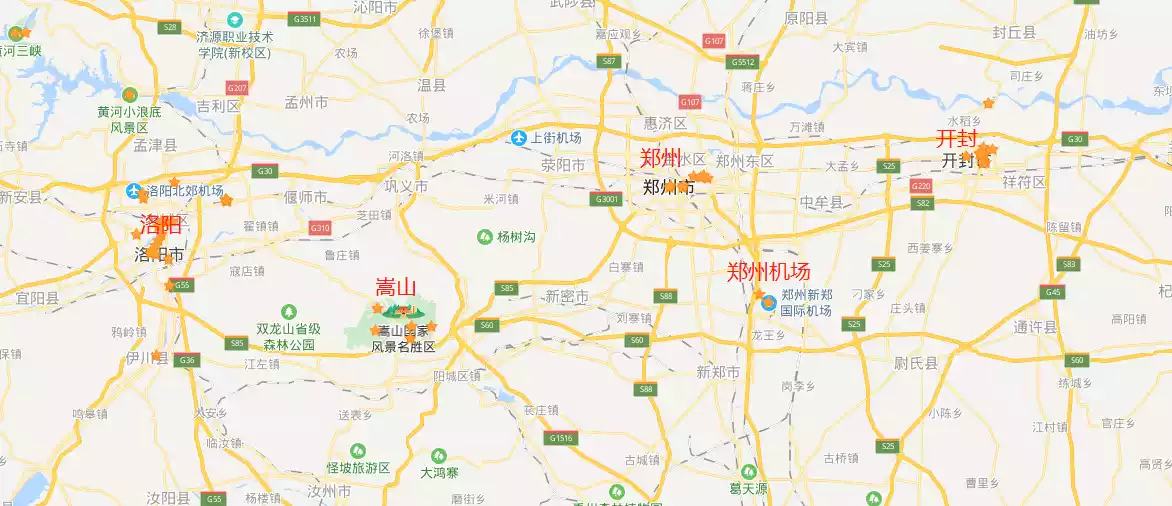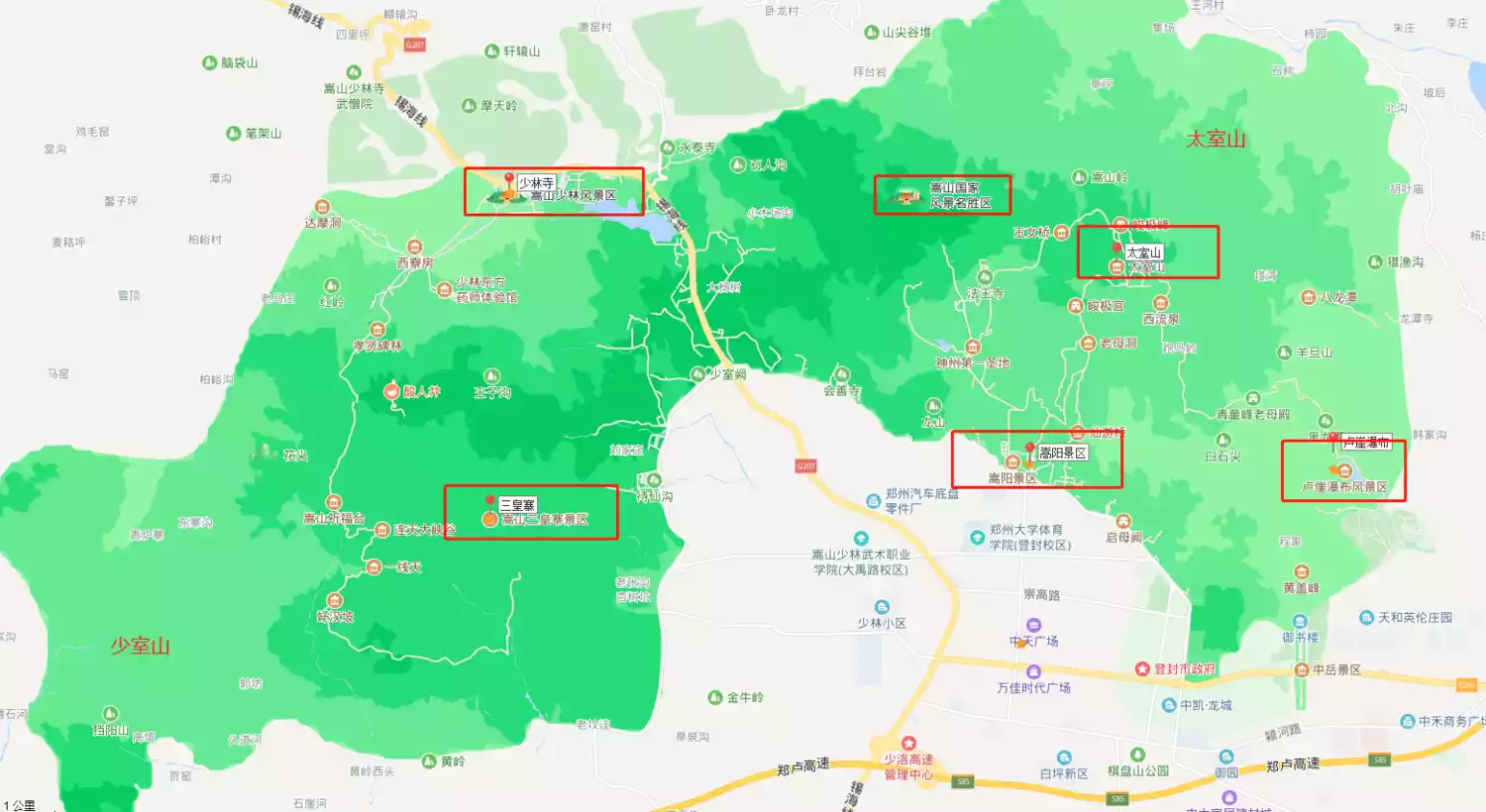 Songshan Mountain is located between Luoyang and Zhengzhou. Getting there from either city is relatively easy, with a drive of about 1.5 hours and a taxi fare of around 250-300 RMB. Next, we'll discuss public transportation options, including how to get there from Luoyang and Zhengzhou.