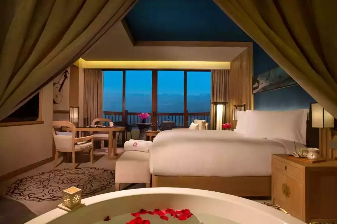The hotel's architectural style is primarily inspired by Tang Dynasty elements, with pavilions, terraces, towers, and pavilions interspersed with modern design, creating a sense of ancient grandeur yet a touch of modern luxury. The overall environment is tranquil, elegant, and dignified, with captivating greenery and landscaping, creating a tranquil escape.