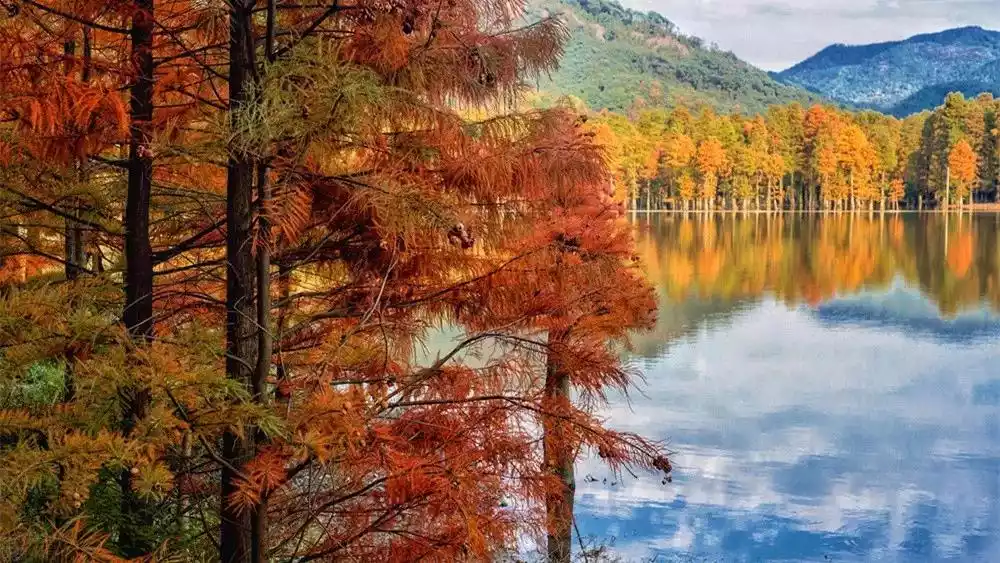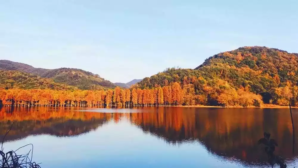 The reservoir on the top of the mountain is as smooth as a mirror. In late autumn, the leaves of the Metasequoia have turned red, turning it into a redwood forest.