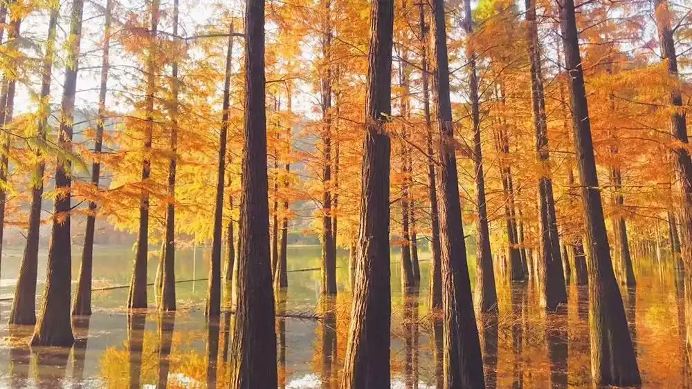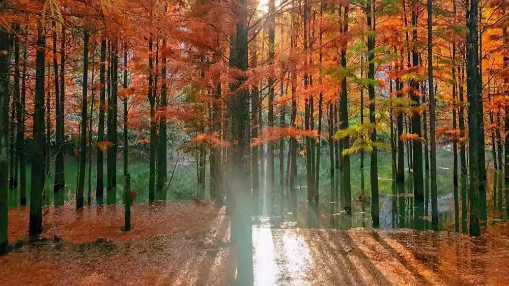 Autumn at Metasequoia Lake is truly breathtakingly beautiful. The thousands of acres of Metasequoia trees growing on the waterside don their new attire in late autumn and early winter. Continuous expanses of germanium-red paint the forest, a vibrant scene of cedars. Flocks of waterfowl playfully frolic on the lake's surface, while lush reeds sway in the breeze.