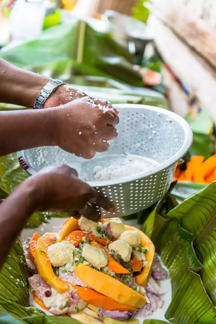 The food consisted of sweet potatoes, papaya, chicken, and some local vegetables. The coconut juice was squeezed by hand, giving the vegetables and meat a rich coconut aroma.