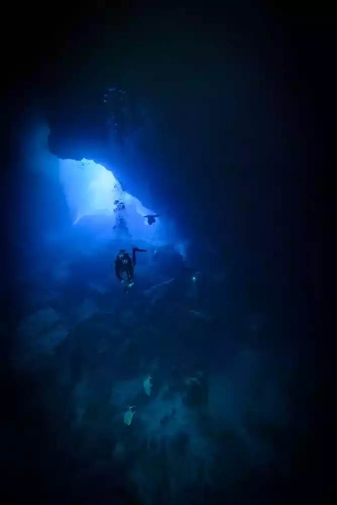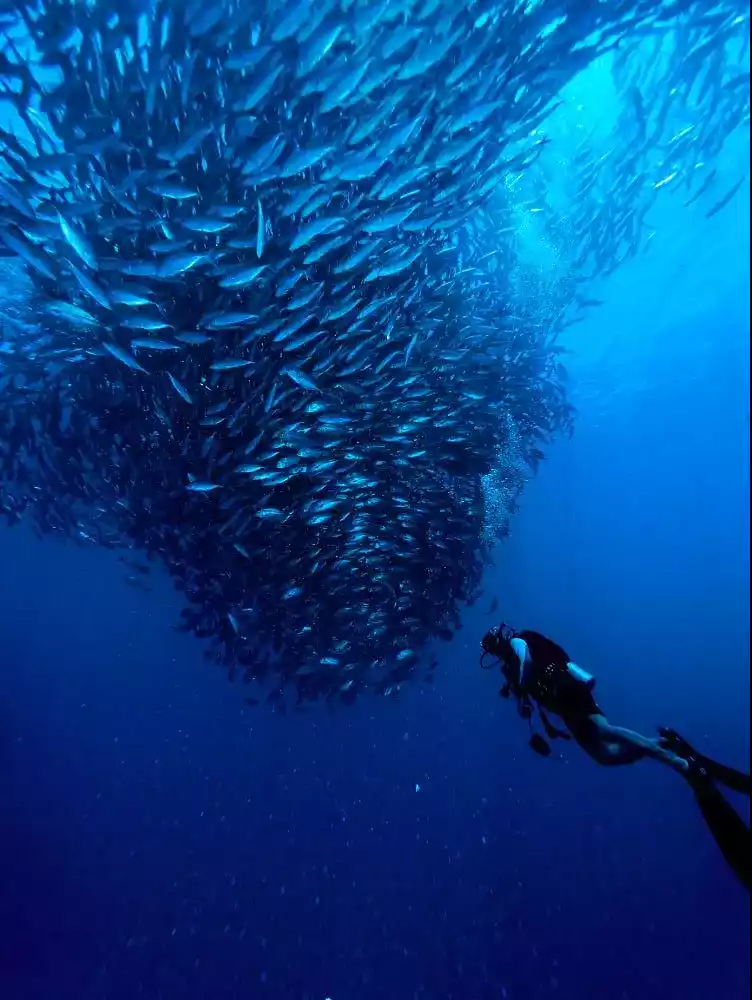 The shadows cast by the sunlight on the rocks attract many schools of fish. The underwater world of the blue hole is even more exciting than the one on land.