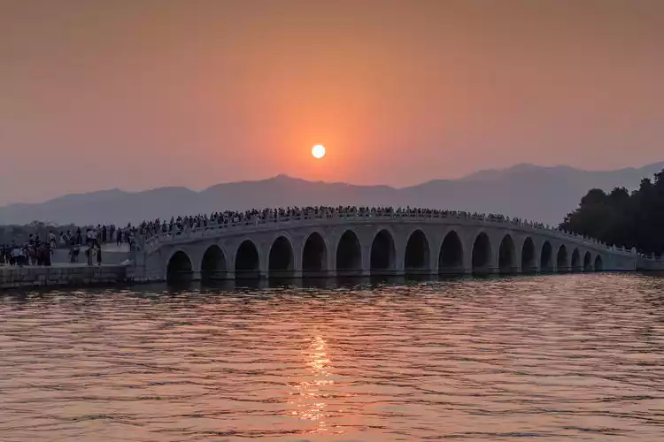 Another famous spot within Kunming Lake is the Seventeen-Arch Bridge. The "golden light shining through the holes" phenomenon, widely known in photography circles, is the result of this phenomenon, said to only appear around the winter solstice. The Seventeen-Arch Bridge at sunset offers a unique beauty.