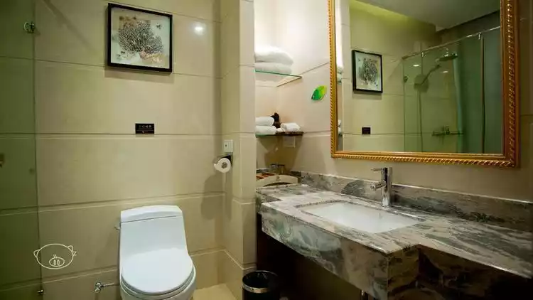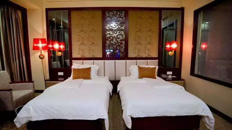 The lobby is quite large, with an elevator taking you to the next floor. The standard twin room is simply decorated and quite spacious. The LCD TV in the room is not large, but it comes with a practical desk and two armchairs. There is free WI-FI, but the signal is not very strong. There is central air conditioning, and the bathroom is a couple's style with transparent glass, separate wet and dry areas, and a shower room.