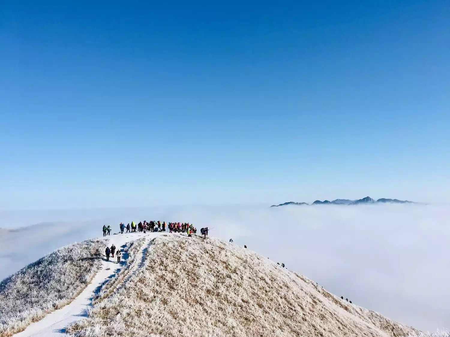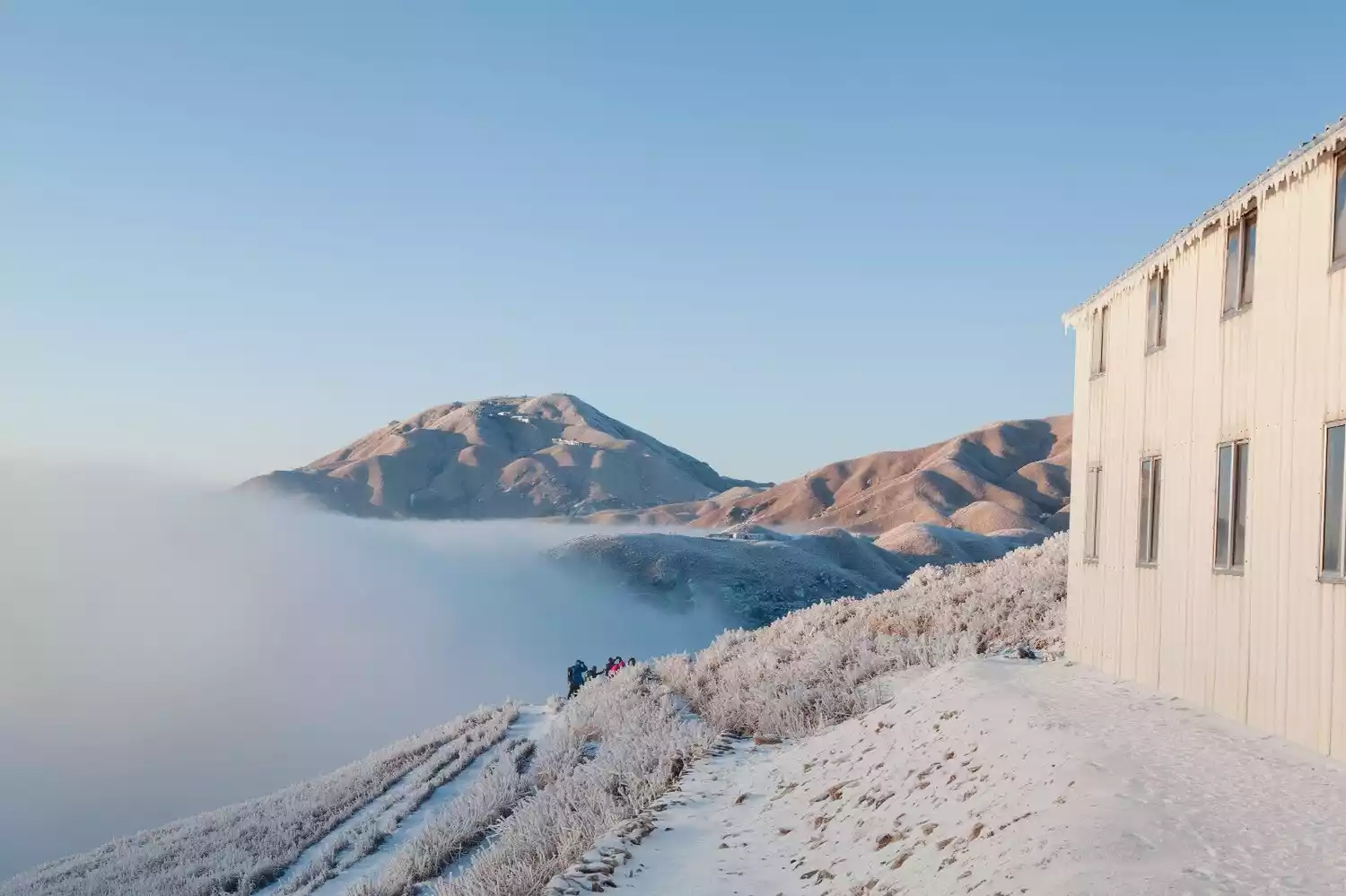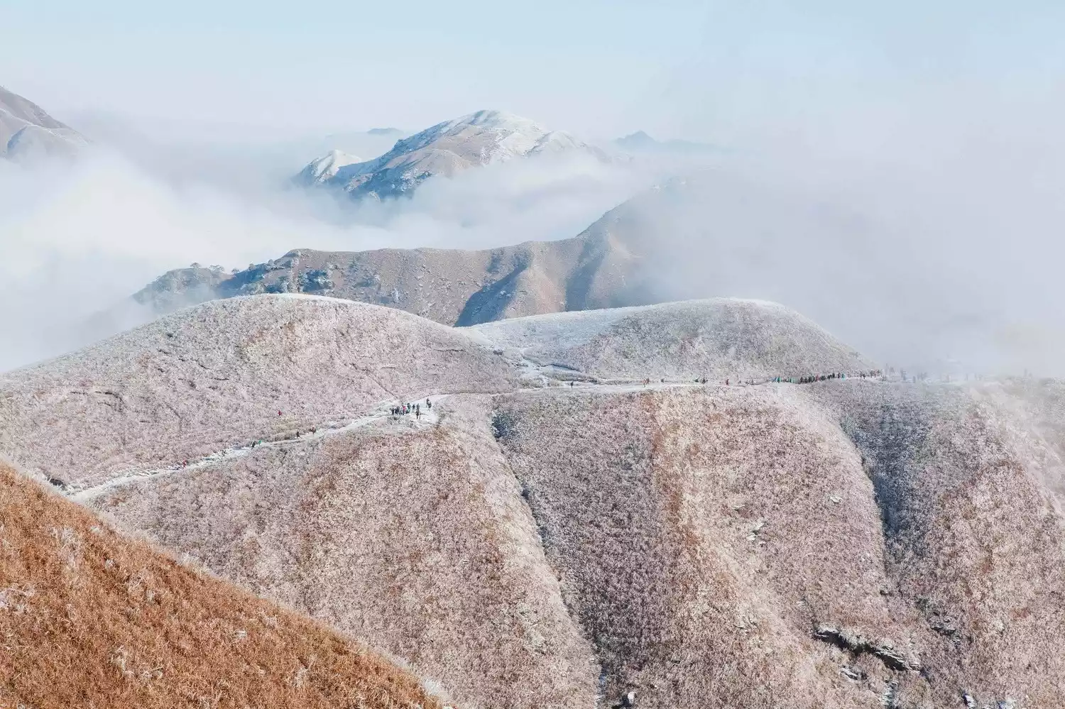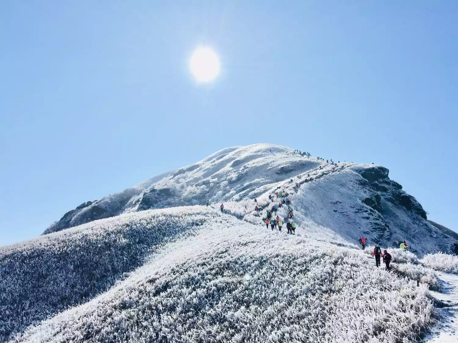 But you might not know that Wugong Mountain in winter is also a fairyland! Hundreds of thousands of acres of alpine meadows are covered in snow and frost, and the glittering ice flowers blend seamlessly with the surging sea of clouds!
