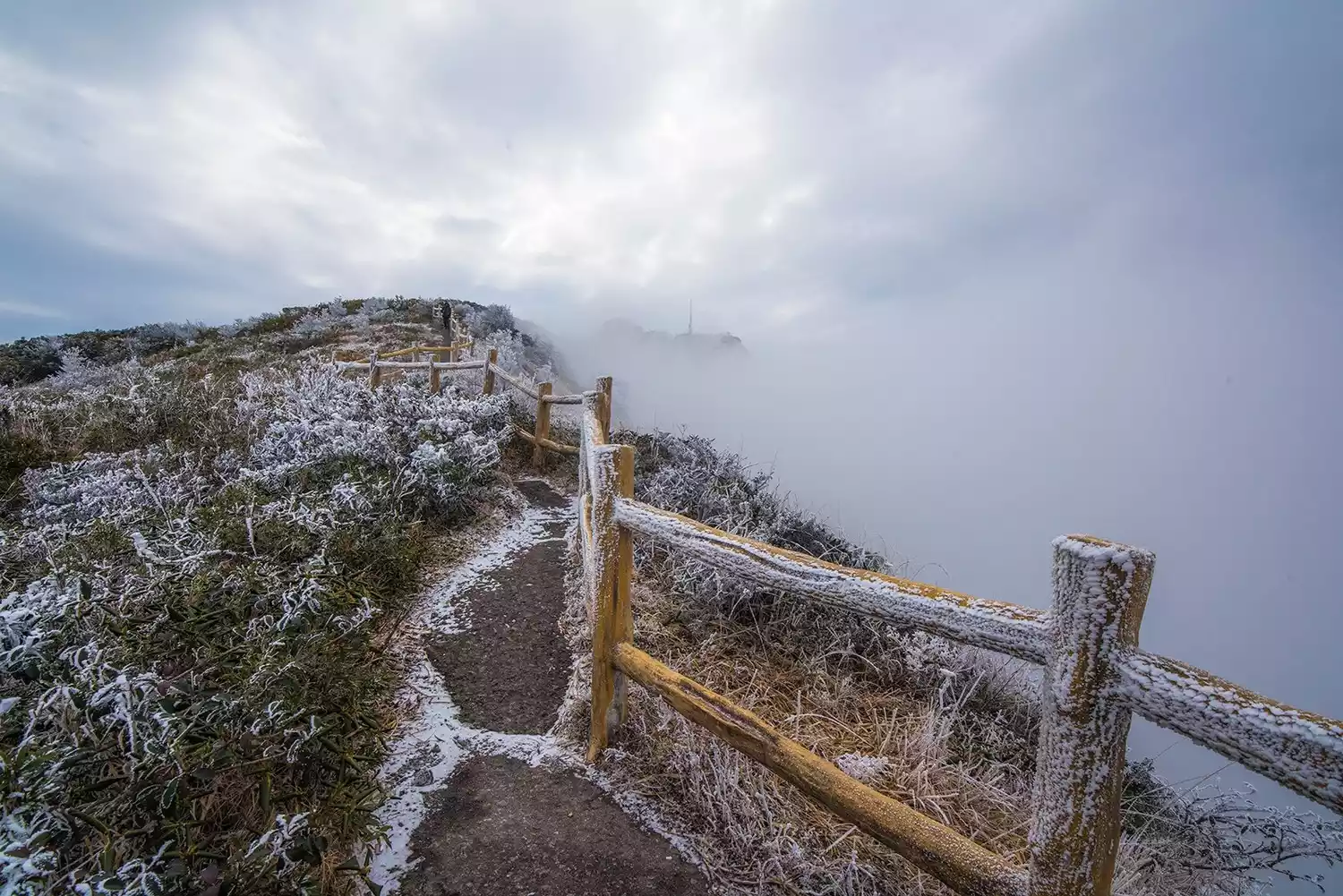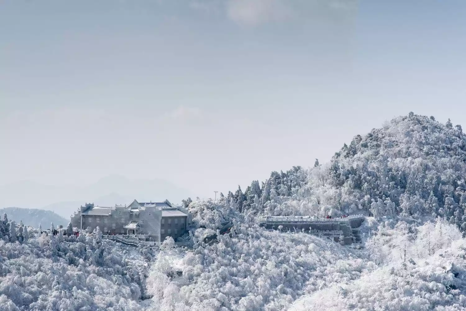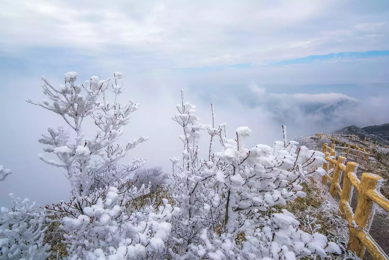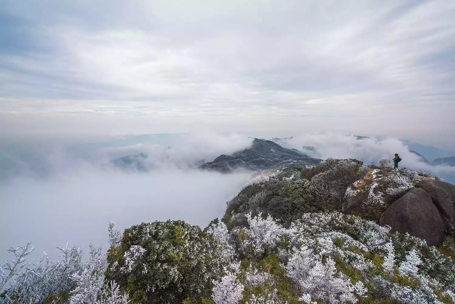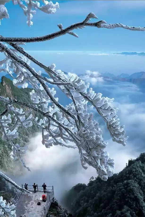 Two weeks ago, a strong cold front cast a thin haze of rime across the summit of Mount Nanyue. The high-altitude areas above Tianzhu Peak have transformed into a world of ice and snow, awaiting your arrival to experience the rime, sea of clouds, and sunrise!