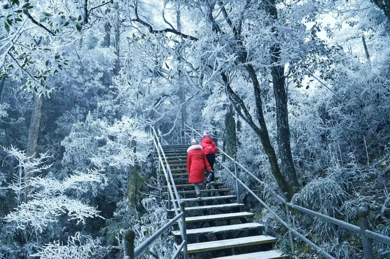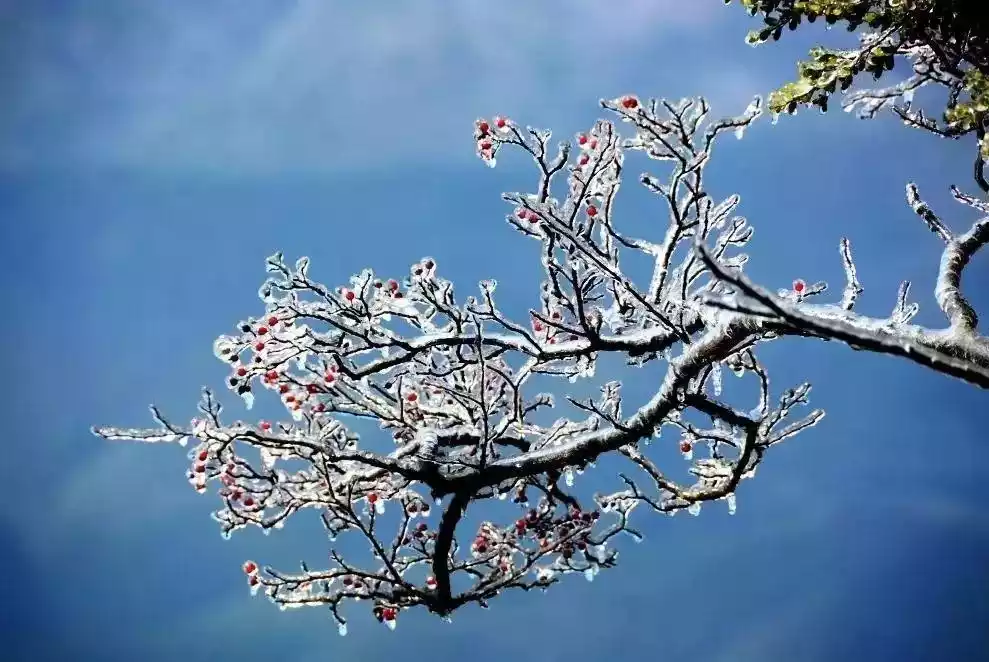 When Maoer Mountain dons its winter attire and is covered in rime, the crystal-clear ancient trees and curved vines take on unique shapes. The mountain's treasure, the southern hemlock, becomes even more elegant, creating a southern fairy tale of ice and snow.