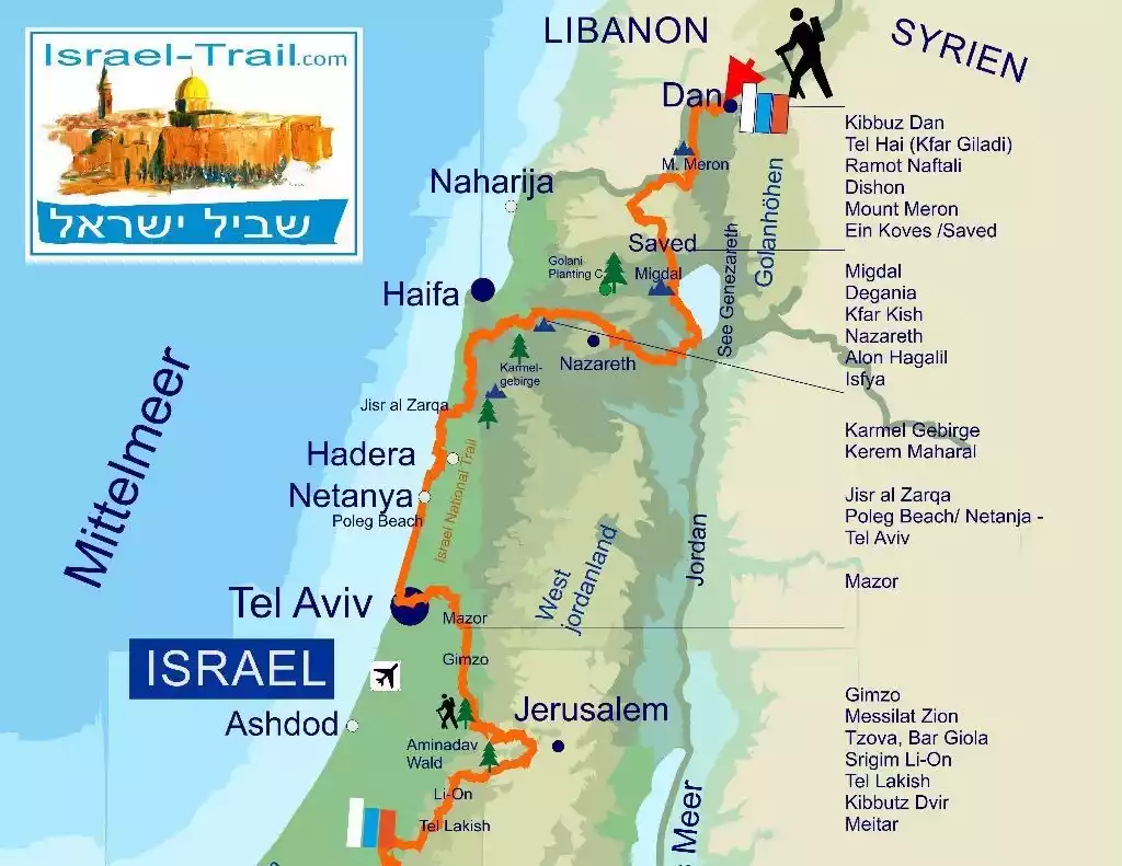 The trail traverses Israel, starting in the village of Dan near the border with Lebanon and heading south to Eilat on the Red Sea. It passes the baptismal Jordan River and the awe-inspiring remnants of Mount Tavor, where General Barak and 10,000 Israelis defeated the Canaanites. The trail then follows the Mediterranean Sea near Tel Aviv and climbs Mount Carmel. Other visual delights along the way include wildflower meadows, Nubian sheep, and semi-nomadic Bedouin migrating across the plains.