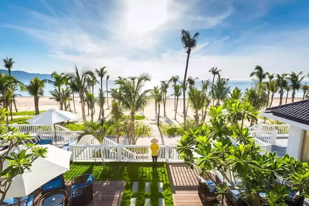 Looking out from the hotel, you can see the blue swimming pool, lush green plants, and bright tropical flowers, which complement each other with a strong Southeast Asian style. The weather is fine, and any photo you take will be an artistic one.