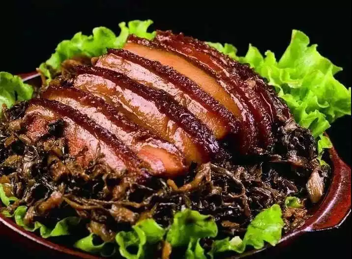 Shaoxing also boasts the Three Wus, a unique cultural phenomenon: the black felt hat, the black sailboat, and the black dried vegetable. The black felt hat is inseparable from the Shaoxing people's ancient aesthetic preference for black, and is a cultural heritage with distinct regional characteristics. Wu dried vegetable, also known as moldy dried vegetable, is named for its black color. It is typically made from mustard greens, cabbage, and rapeseed, pickled and sun-dried. Steaming pork with moldy dried vegetable is a quintessential Shaoxing dish, "Steamed Pork with Moldy Dried Vegetables," a representative of Zhejiang cuisine.