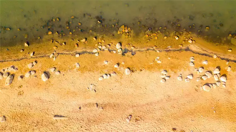 The beach is white and soft, with jagged rocks. Occasionally, odd-shaped pebbles can be found by the lake, their edges smoothed by the water, leaving them incredibly soft. Overlooking the entire park, it feels like a tranquil island, shaded by green trees and offering a sense of leisure and ease.