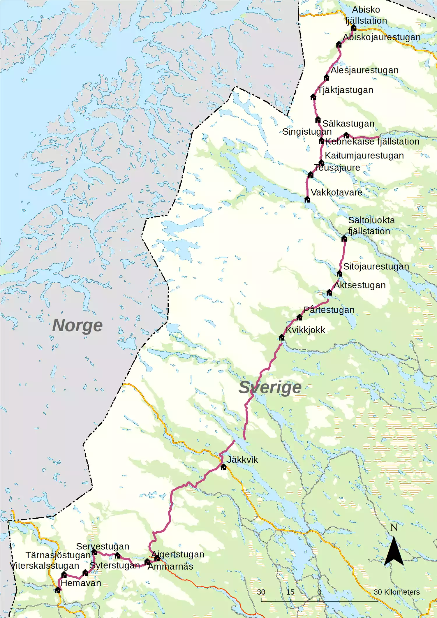 The trail is divided into four sections, each taking about a week to hike. By far the most popular section is between Abisko in the north and Kebna, Sweden's highest peak.