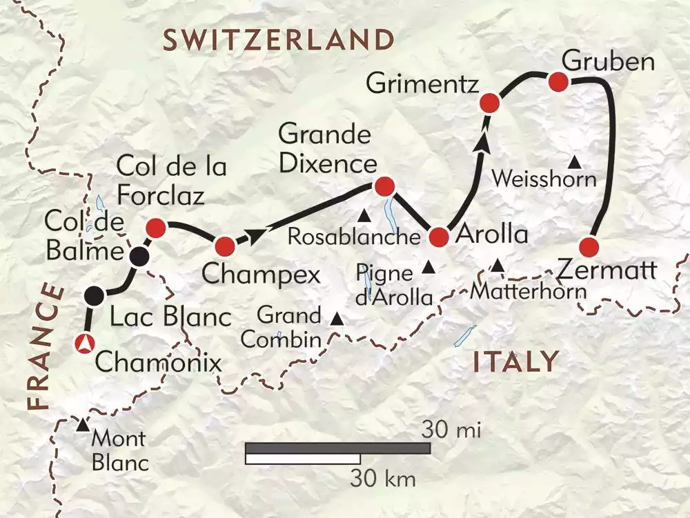 Specific location: France, Switzerland, starting in the small town of Chamonix on the eastern border of France, adjacent to Italy and Switzerland, and ending in Zermatt in Valais, Switzerland