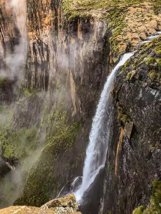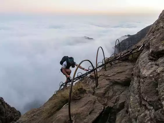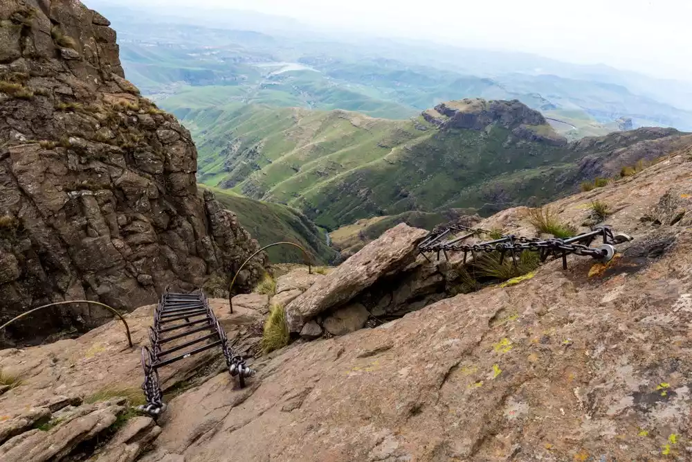 Climb up the chain ladder to the top of the plateau, where the world's second largest waterfall, Tugela Falls, flows down from high to low in five streams.