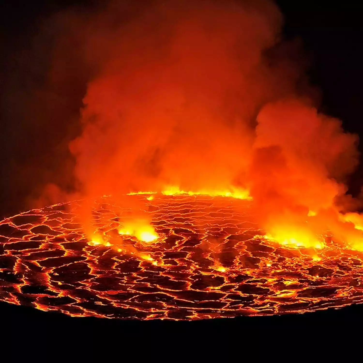 The mounds of yellow sulfur make this place look like an alien planet, and the rolling and surging magma lights up the dark night.