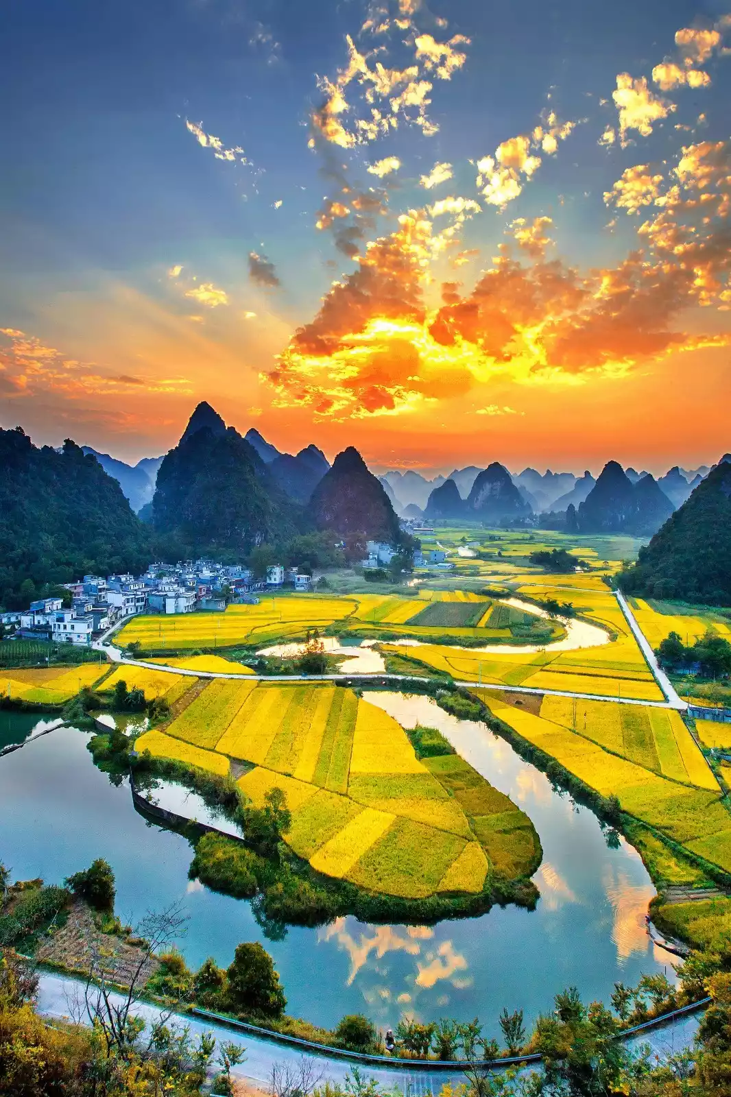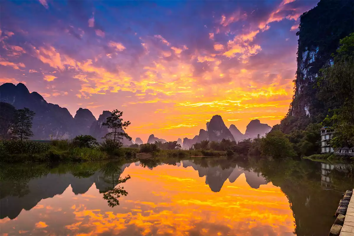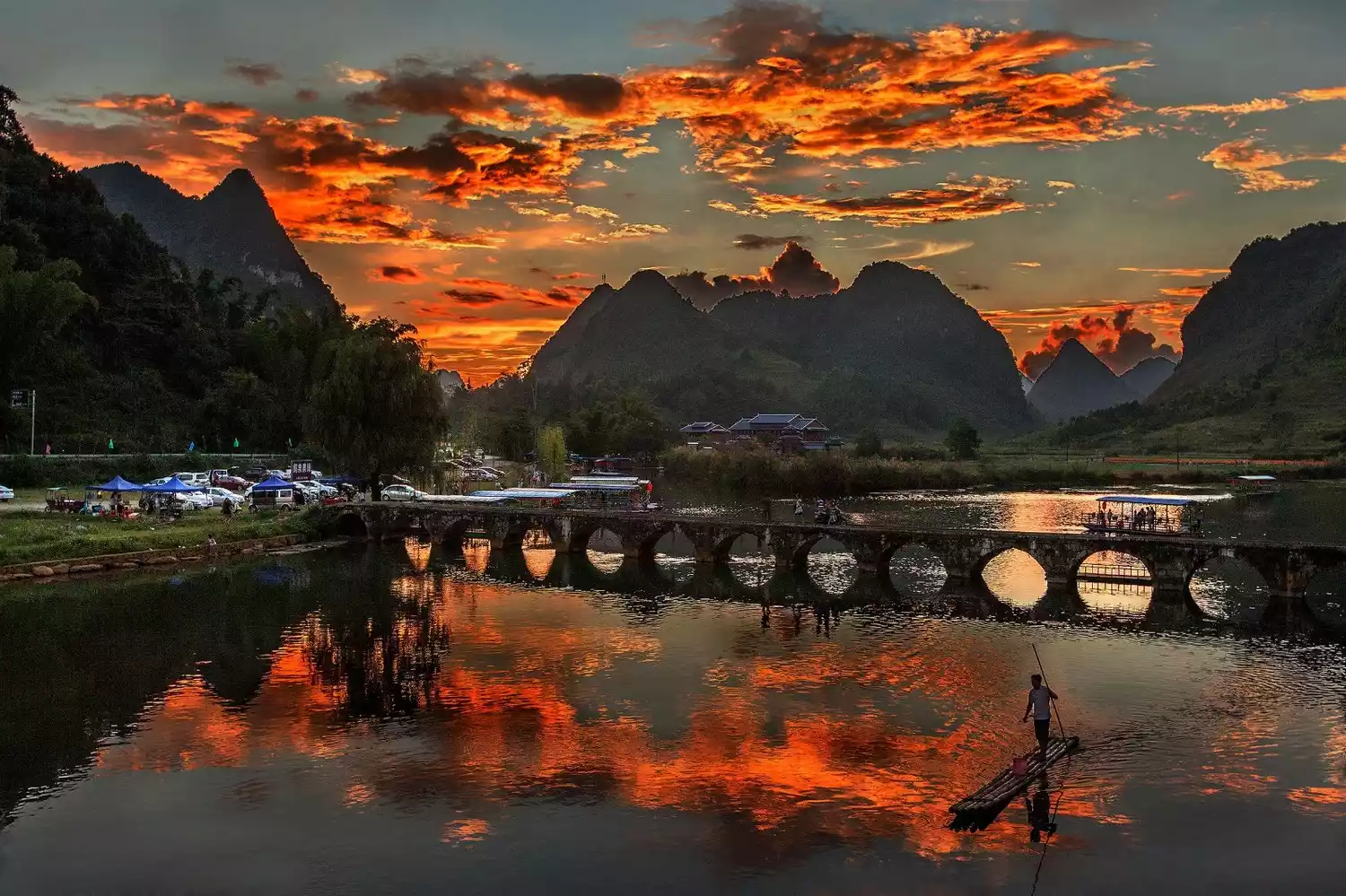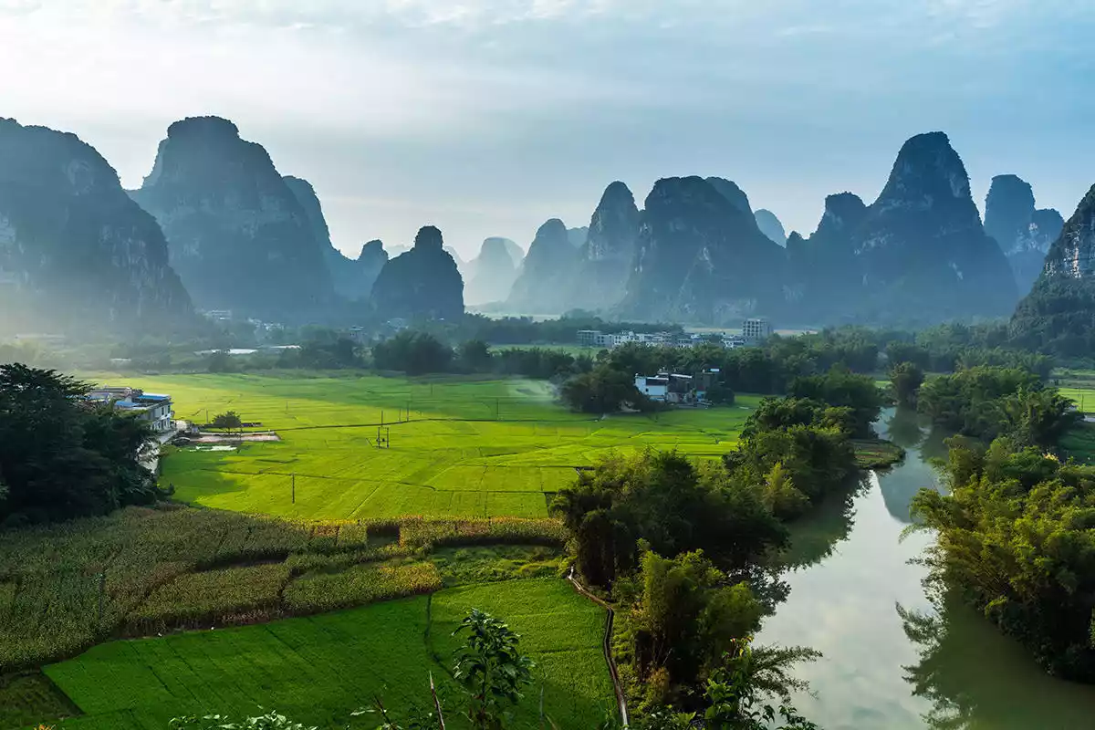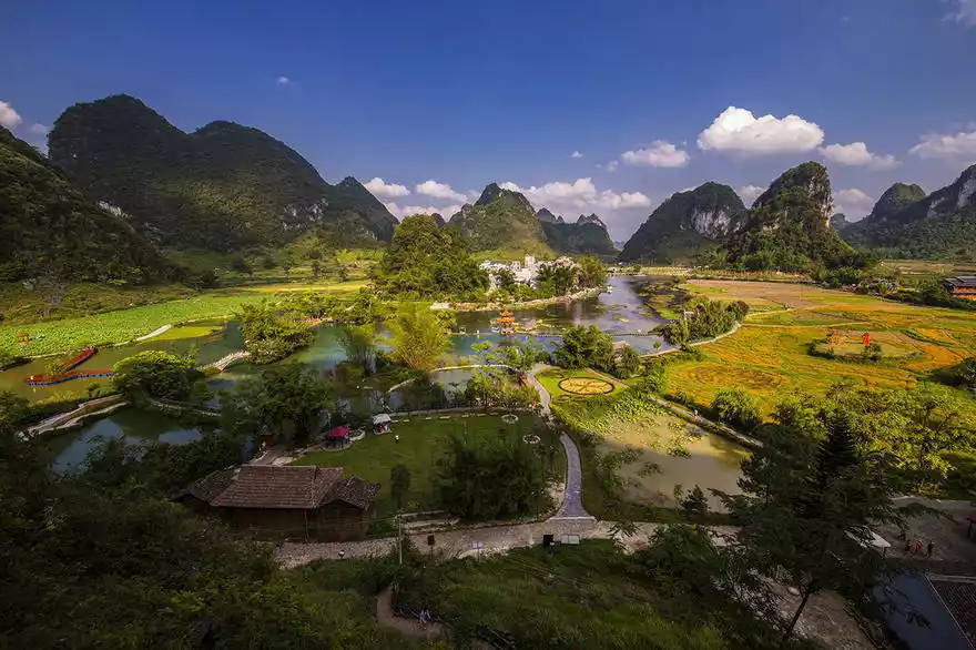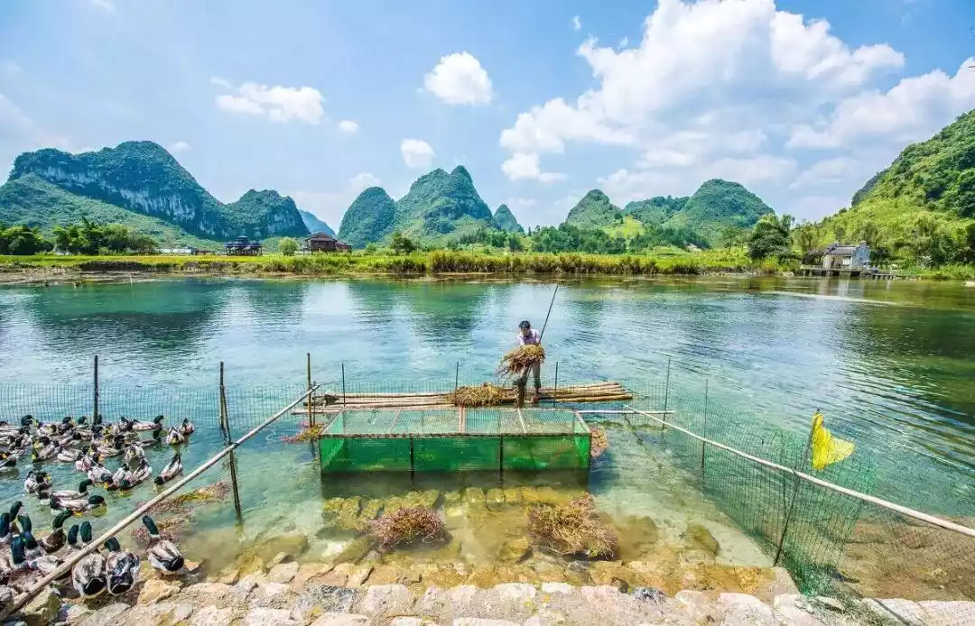 The unique karst topography creates a rare natural landscape here, surrounded by verdant mountains, crystal-clear waters, and picturesque countryside. Without excessive hustle and bustle, people work from sunrise to sunset, much like the secret paradise described by Tao Yuanming.