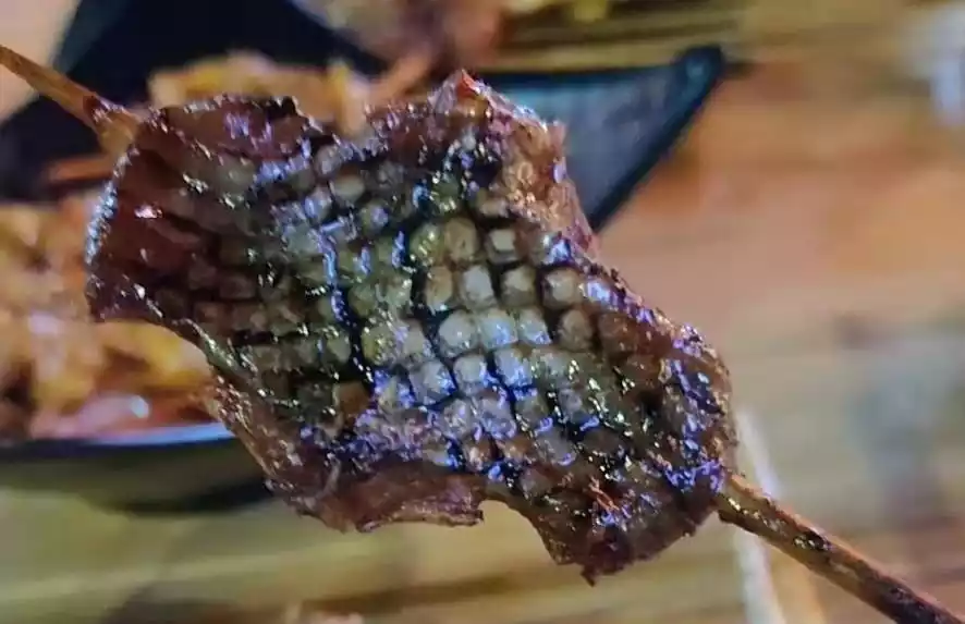 The snake skin becomes crispy and tough when baked over an open flame. Adding seasonings in batches enhances the flavor. It would be a shame not to try it.