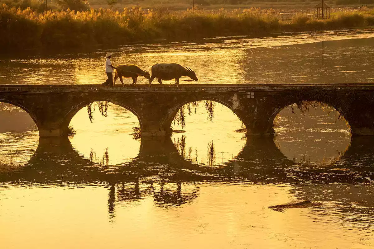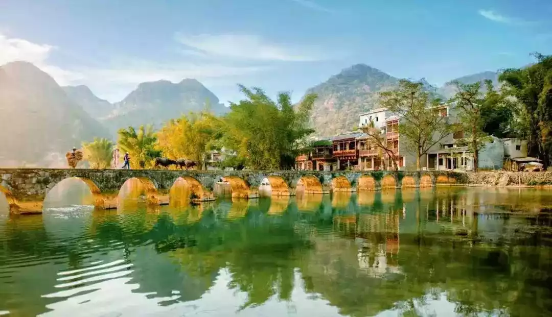 The 15-arch bridge, one of the scenic spots of Equan, was built in the Qing Dynasty. It has an ancient charm. Sometimes bamboo rafts pass under the bridge, and farmers drive their cattle across the bridge to go home.