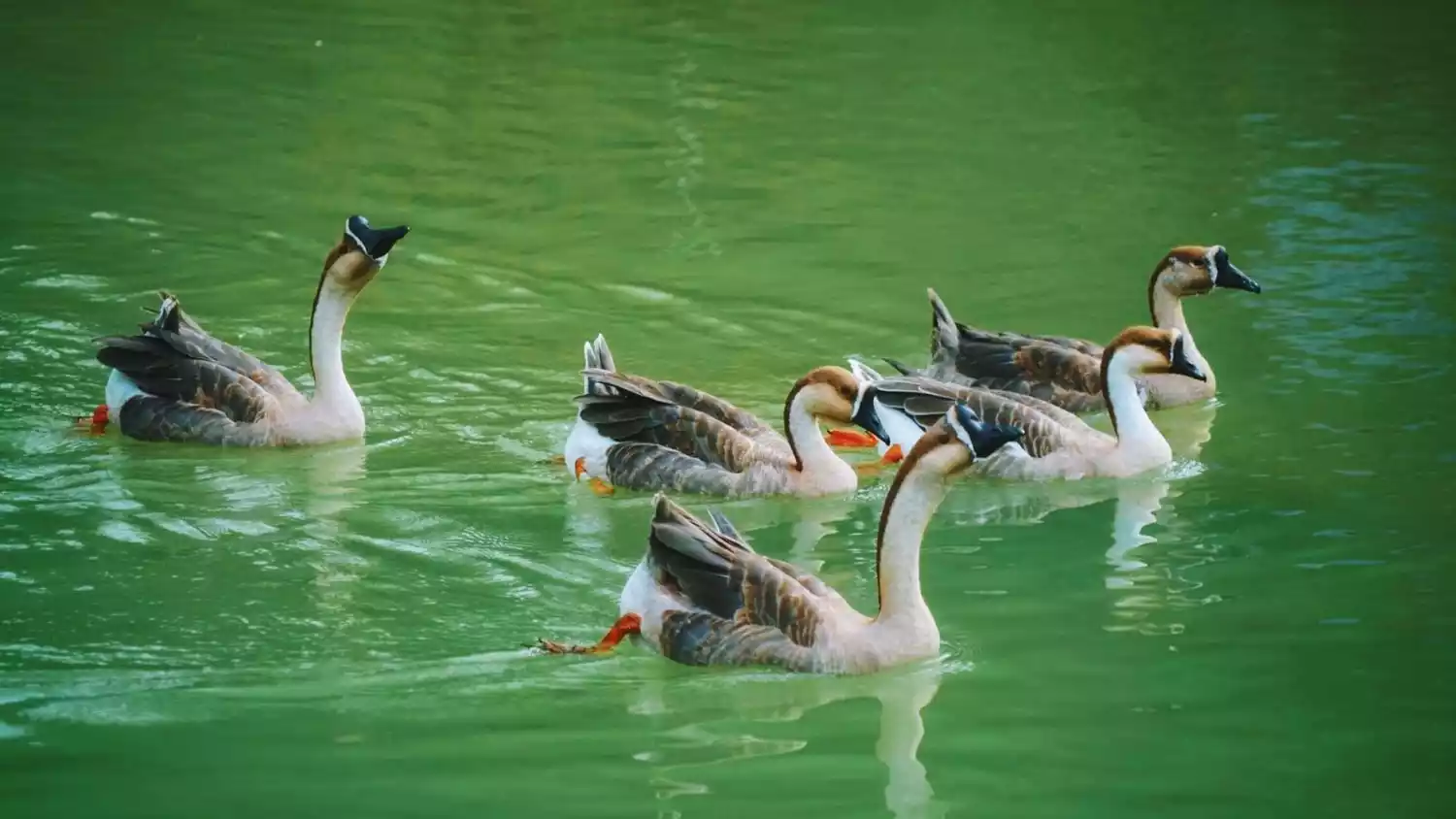 A long, winding bridge, paved with lotus-leaf-like pebbles, connects the two banks. The gurgling waters are adorned with the graceful swimming of geese, fearless of strangers, creating a lively and interesting scene.