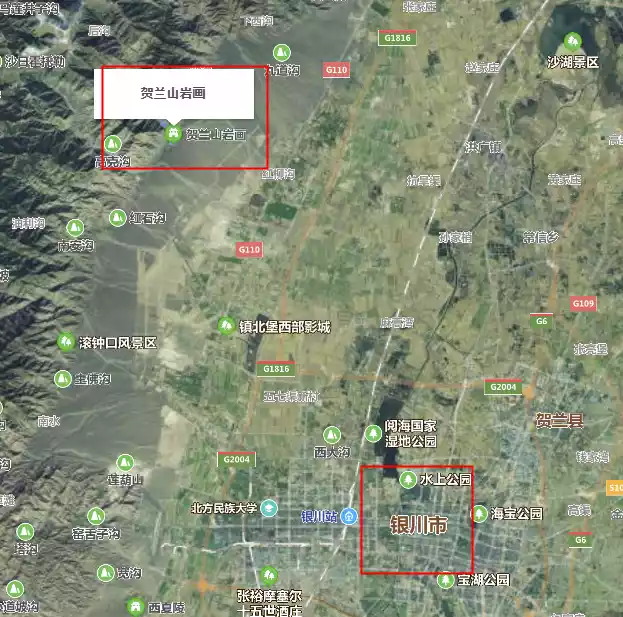 The Helan Mountain rock paintings are distributed on the eastern foot of the Helan Mountains in Ningxia, and the Helan Mountains are located northwest of Yinchuan. The location is as shown in the figure below: