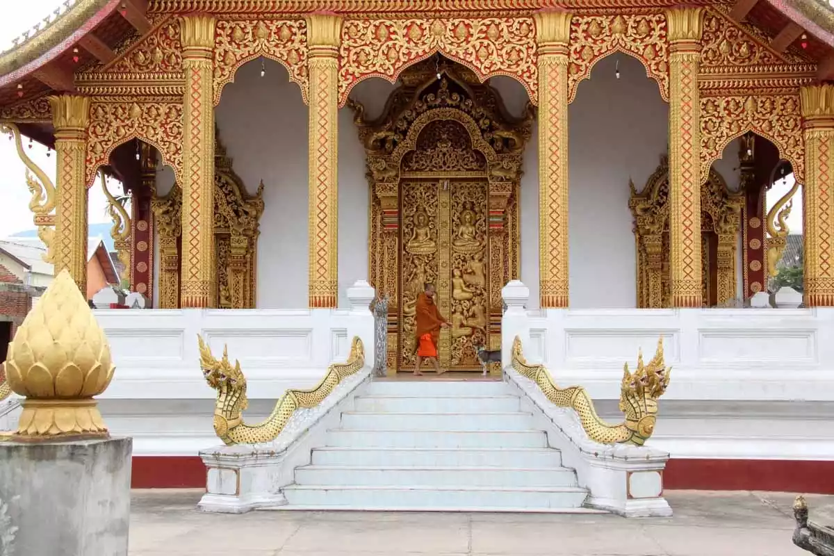 The temple boasts a typical Luang Prabang five-tiered wooden roof, beautifully decorated wooden pillars, and ornate gilded relief walls. The most striking feature are the gilded wood carvings covering the main entrance and walls. These murals depict the entire Indian epic "Ramayana," recounting the life of the Buddha and the Laotian rain god, as well as scenes from the Ramayana and rural life. During important festivals, the Prabang Buddha statue is brought from the Royal Palace Museum and displayed here for worship.