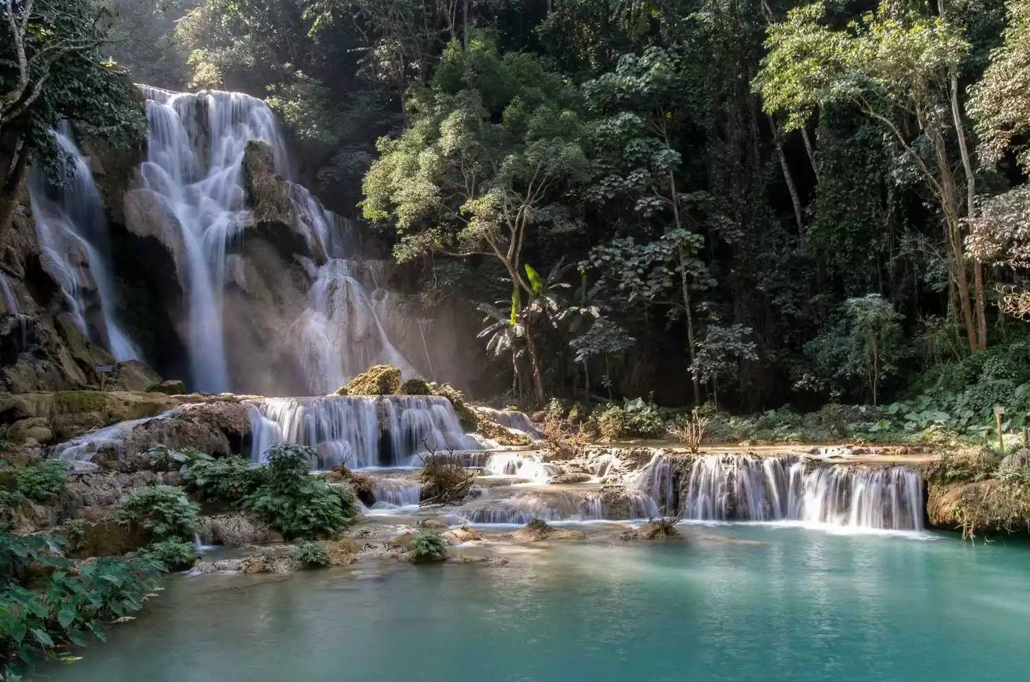 Kuang Si Waterfall is the largest waterfall in Luang Prabang. It is located about 30km south of Luang Prabang. It is a waterfall group consisting of one large waterfall and several small waterfalls at the foot of the mountain. The total height of the waterfall is 100 meters. It pours down from the limestone peak and gathers into pools at the foot of the mountain. It is a fairyland-like blue. The whole scenery is beautiful and picturesque, somewhat like the calcification pool in Huanglong, Sichuan, like a dream.