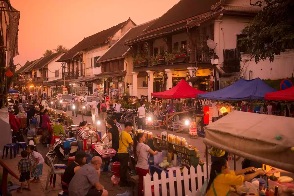 Stroll through the city, where ancient temples and colonial French villas stand side by side. As night falls, the sunset glow over Mount Phousi blends beautifully with the emerald waters of the Mekong River. Wander through the night market, where you'll be overwhelmed by the myriad handicrafts and enthusiastic vendors. Within this city, monks in orange robes, whitewashed, red-tiled Western-style buildings, the red and blue night market tents, and the vibrant sunset create a breathtaking tapestry.